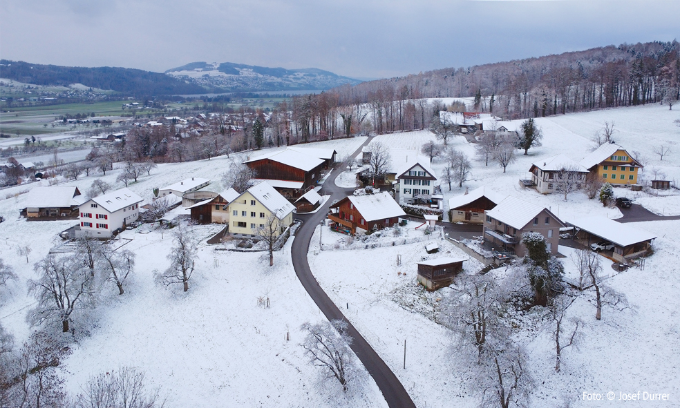 Der erste Schnee (21. November 2025) im Seetal legt einen weissen Schleier über die Dörfer und Hügel. Foto von Bleulikon ob Hitzkirch.