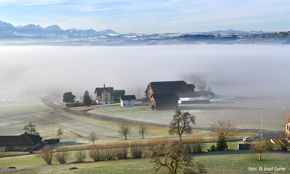 Klassiker: "unten grau oben blau". (Hof Hirzehalde, Hohenrain, im Hintergrund Rain und die Entlebucher Berge)